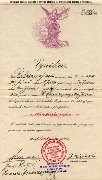 Drogerie-Assistent in der Drogerie Rudolf Horak in Neutitschein vom 1. Juli 1932 bis zum 31. Mai 1933.