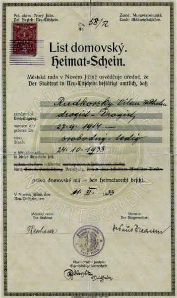 Heimatschein der Gemeinde Neutitschein am 11. November 1933.
