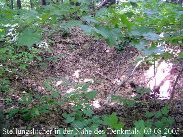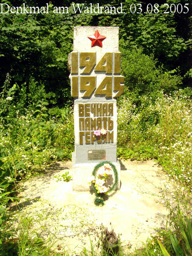 Auf schlammigen Feldwegen ging es am Rand des im Südosten Ternowajas gelegenen Waldes entlang; an diesem Waldrand lag mein Großvater vom 13.-23.03.1942. An einer Straßenkreuzung steht heute ein sowjetisches Denkmal; dahinter sind noch die Schützenlöcher und Stellungen der Artillerie zu erkennen, welche hier stationiert gewesen war.