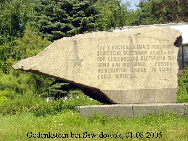 An diesem Tag folgten wir dem Verlauf des Dnjeprs bis nach Tscherkassy, wo wir außerdem den Ort Sswidowok aufsuchten, bei welchem mein Großonkel SS-Unterscharführer Alois Schwarzer gefallen war. An die schweren Kämpfe in diesem Gebiet erinnert ein sowjetischer Gedenkstein.